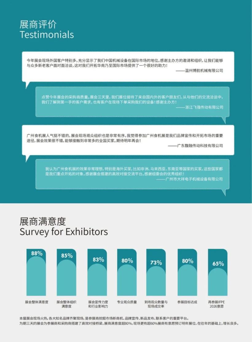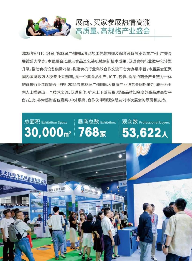2025年6月12-14日,第33屆廣州國際食品加工包裝機(jī)械及配套設(shè)備展覽會在羊城廣州盛大舉辦。本次展會匯聚食品加工機(jī)械、食品包裝設(shè)備、食品飲料機(jī)械、包裝材料、配套器材、包裝印刷機(jī)械等眾多細(xì)分板塊的領(lǐng)軍企業(yè)和品牌。IFPE 2025以展示食品及包裝機(jī)械創(chuàng)新技術(shù)成果,促進(jìn)食機(jī)行業(yè)數(shù)字化轉(zhuǎn)型升級,加快產(chǎn)業(yè)鏈上下游供需對接為辦展宗旨。展會精準(zhǔn)邀約數(shù)萬人次國內(nèi)外專業(yè)采購商參展,為食機(jī)產(chǎn)業(yè)搭建了一個高效合作對接交流平臺,獲得了廣大參展商和采購商的共同贊譽(yù)。
