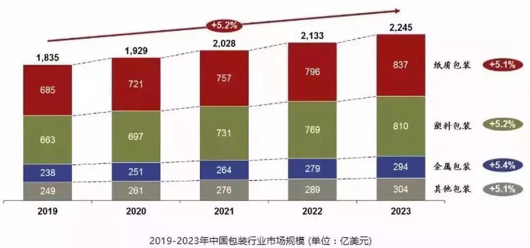 據(jù)科爾尼公司預(yù)測,2020年中國包裝行業(yè)市場規(guī)模將突破1900億美元,約占亞太市場55%的份額,并將以約5%的速度持續(xù)增長,高于全球市場約4%的整體增長預(yù)期。其中,紙質(zhì)和塑料包裝分別占比約37%,金屬占比約13%。