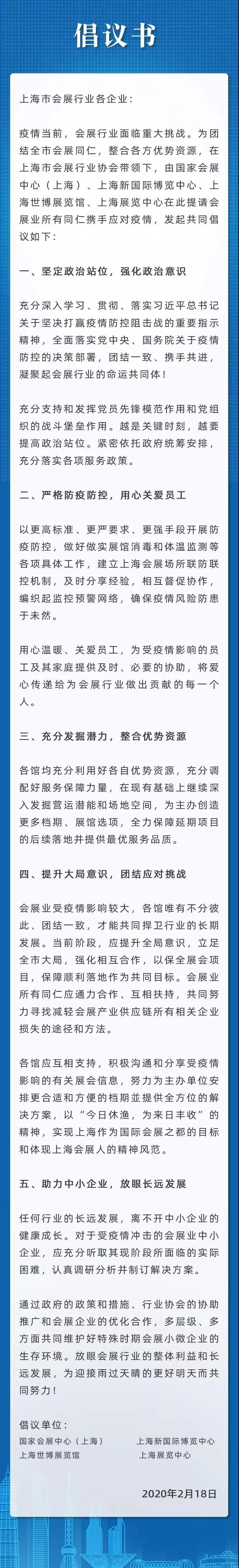 與此同時(shí),一份由國家會(huì)展中心(上海)提議、上海展覽業(yè)協(xié)會(huì)指導(dǎo),上海新國際博覽中心、世博展覽館、上海國際展覽中心昨天共同發(fā)起的倡議書,也向社會(huì)公開發(fā)布?!冻h書》明確“不讓任何一個(gè)受延期影響的展覽會(huì)因沒有檔期和場地而取消”。