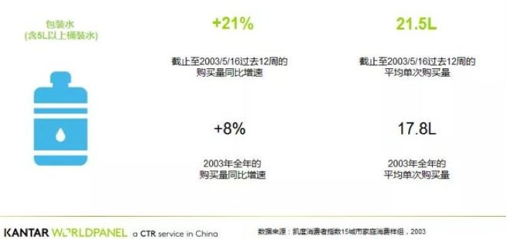事實(shí)上,在2003年SARS期間,包裝水的銷量也在攀升。凱度消費(fèi)者指數(shù)的分析揭示,2003年SARS感染高發(fā)期間,包裝水需求量凸起,尤其在北京,由于許多家庭紛紛在此期間進(jìn)行大量囤貨,包裝水的購(gòu)買量在2003年3-5月間增長(zhǎng)了21%。
