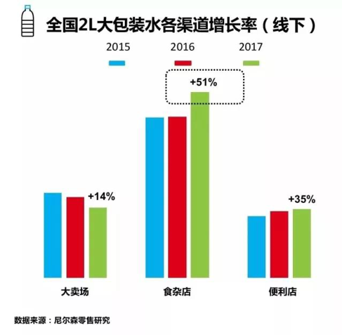 據(jù)尼爾森數(shù)據(jù),盡管400-800ml的包裝水仍然主導(dǎo)市場(chǎng),但2L以上大包裝增速尤其亮眼。2017年食雜店的銷量增長(zhǎng)率達(dá)到了51%。