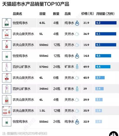 線下增速迅猛,線上更是成為消費(fèi)主流。在天貓?jiān)落N量前10的水大體分為兩類,一類是4L左右的大桶裝,一類是小瓶礦泉水。其中,大桶裝水占據(jù)熱銷半數(shù),而銷量領(lǐng)先的兩個(gè)產(chǎn)品都是4.5L以上的大桶水。