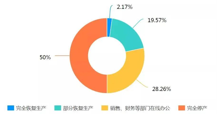 如下表所示,截止2020年2月16日,有2.17%的企業(yè)已經(jīng)完全恢復(fù)生產(chǎn)經(jīng)營(yíng),19.57%的企業(yè)部分恢復(fù)生產(chǎn),有28.26%的企業(yè)銷售、財(cái)務(wù)等部門(mén)處于在線辦公的狀態(tài),50%的企業(yè)處于完全停產(chǎn)狀態(tài)。