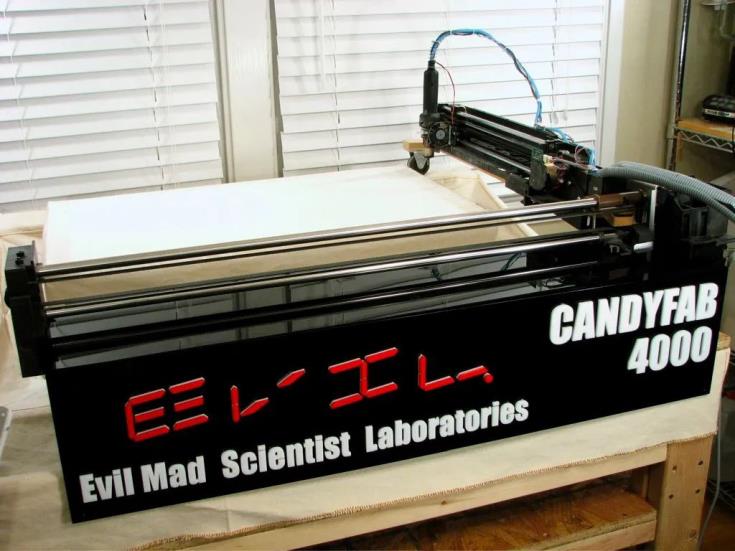 于是乎,從2007至2009年,位于美國加州的一個小型機(jī)械實(shí)驗(yàn)機(jī)構(gòu)Evil Mad Scientist Laboratories就成功建造出三臺DIY 3D打印機(jī)CandyFab 4000、5000和6000。據(jù)悉,CandyFab系列機(jī)器能夠使用一種稱為選擇性熱空氣燒結(jié)和熔化 (SHASAM) 的新工藝,通過將糖粒與熱空氣一起熔化,從而在低成本下用純糖打印出食品。