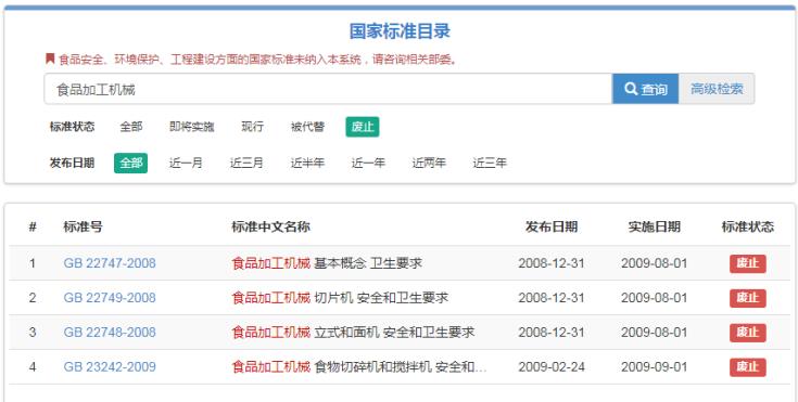 根據(jù)全國標(biāo)準(zhǔn)信息公共服務(wù)平臺公布的消息,關(guān)于食品加工機(jī)械板塊有四項(xiàng)舊國家標(biāo)準(zhǔn)廢止,四項(xiàng)新國標(biāo)同步代替實(shí)施。