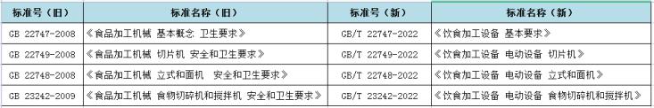 本次廢止的舊國標(biāo)涉及切片機(jī)、立式和面機(jī)、食物切碎機(jī)和攪拌機(jī)等食品機(jī)械。上述四項(xiàng)國標(biāo)廢止的同時(shí),對應(yīng)的新國標(biāo)同步實(shí)施,具體請看下表: