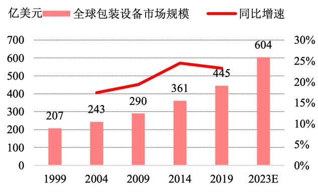 全球包裝設備行業(yè)規(guī)模接近500億美元,其中食品、飲料以及醫(yī)療為最主要下游應用領域。根據(jù)The Freedonia Group,Inc報告,2019年全球包裝設備市場規(guī)模約445億美元,并預計在2023年達到604億美金,預計整體保持5%左右的年均增速。從地區(qū)來看,根據(jù)其預測發(fā)展中國家和地區(qū)包裝設備銷量的增長將成為全球包裝設備發(fā)展的推動力,中國作為最大的發(fā)展中國家,對包裝設備的需求將構成世界最大的市場之一;從下游應用領域來看,2019年全球包裝設備機械中前三大終端應用領域分別為食品、飲料、醫(yī)療,分別占33.5%、24.0%、12.0%。